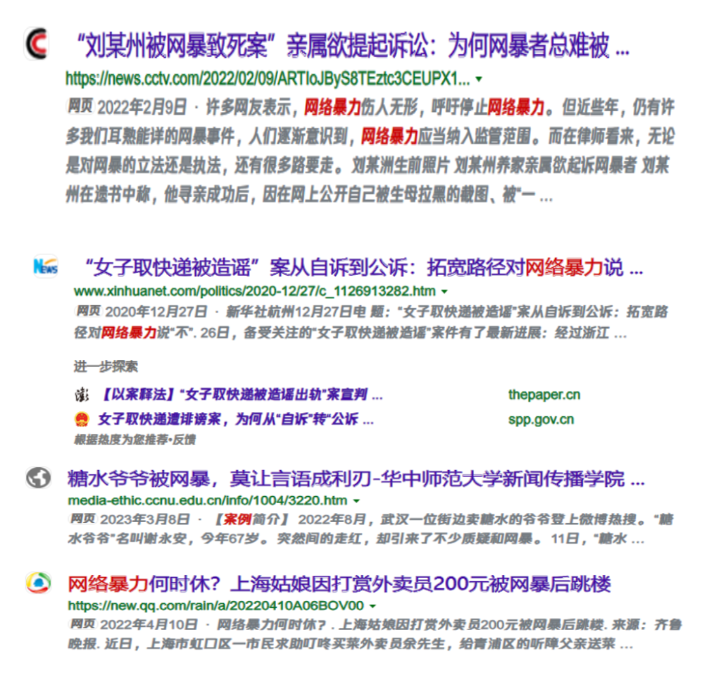 当我们在网络上搜索有关“网络暴力”的关键词就会看到很多关于网络暴力的案例